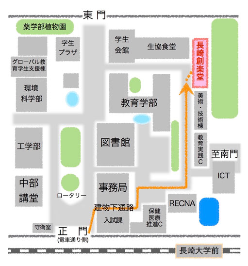 - 長崎バス「長崎駅前」→(1番系統「溝川」「上床」「上横尾」ほか行)→「長崎大学」下